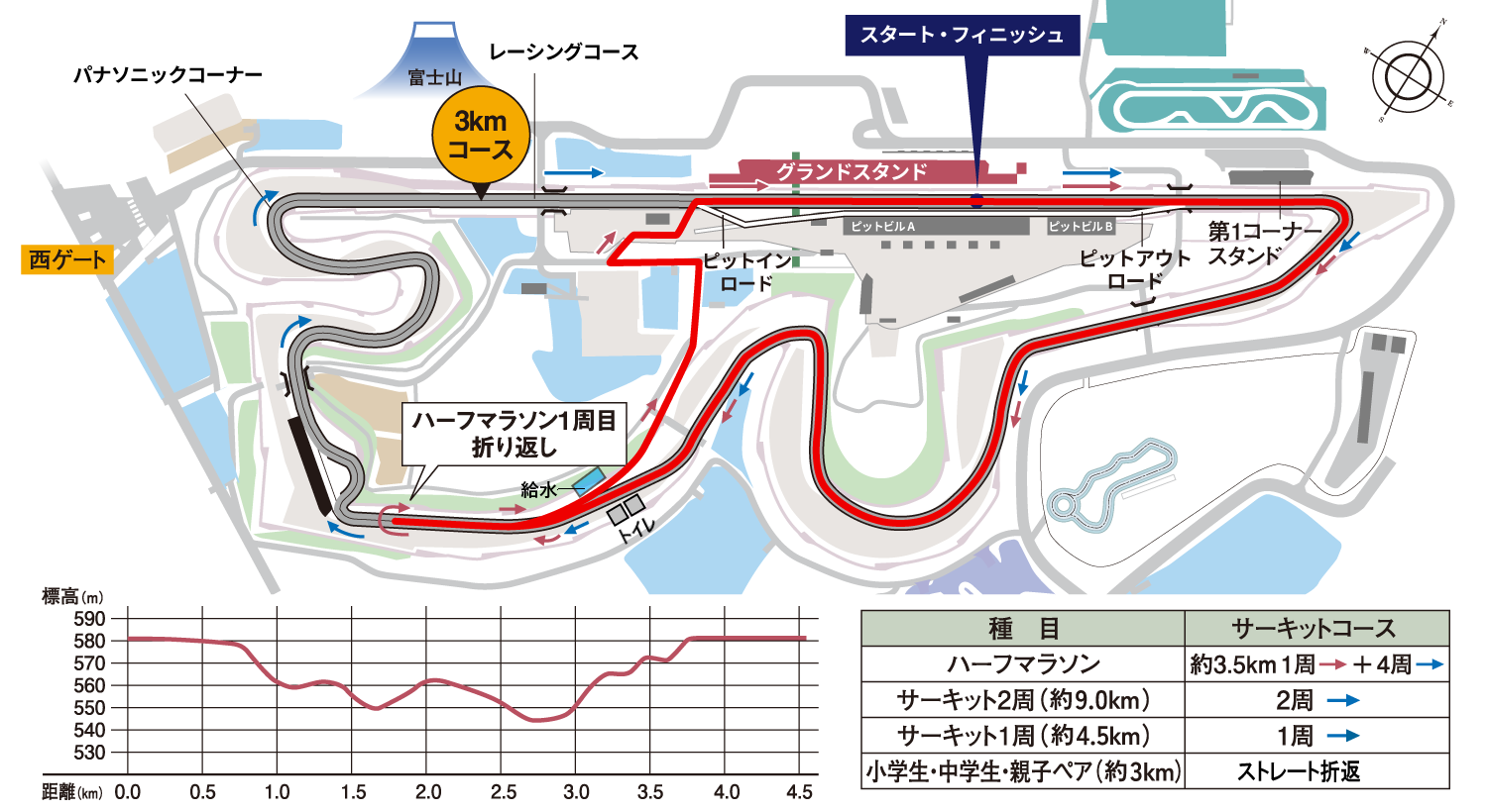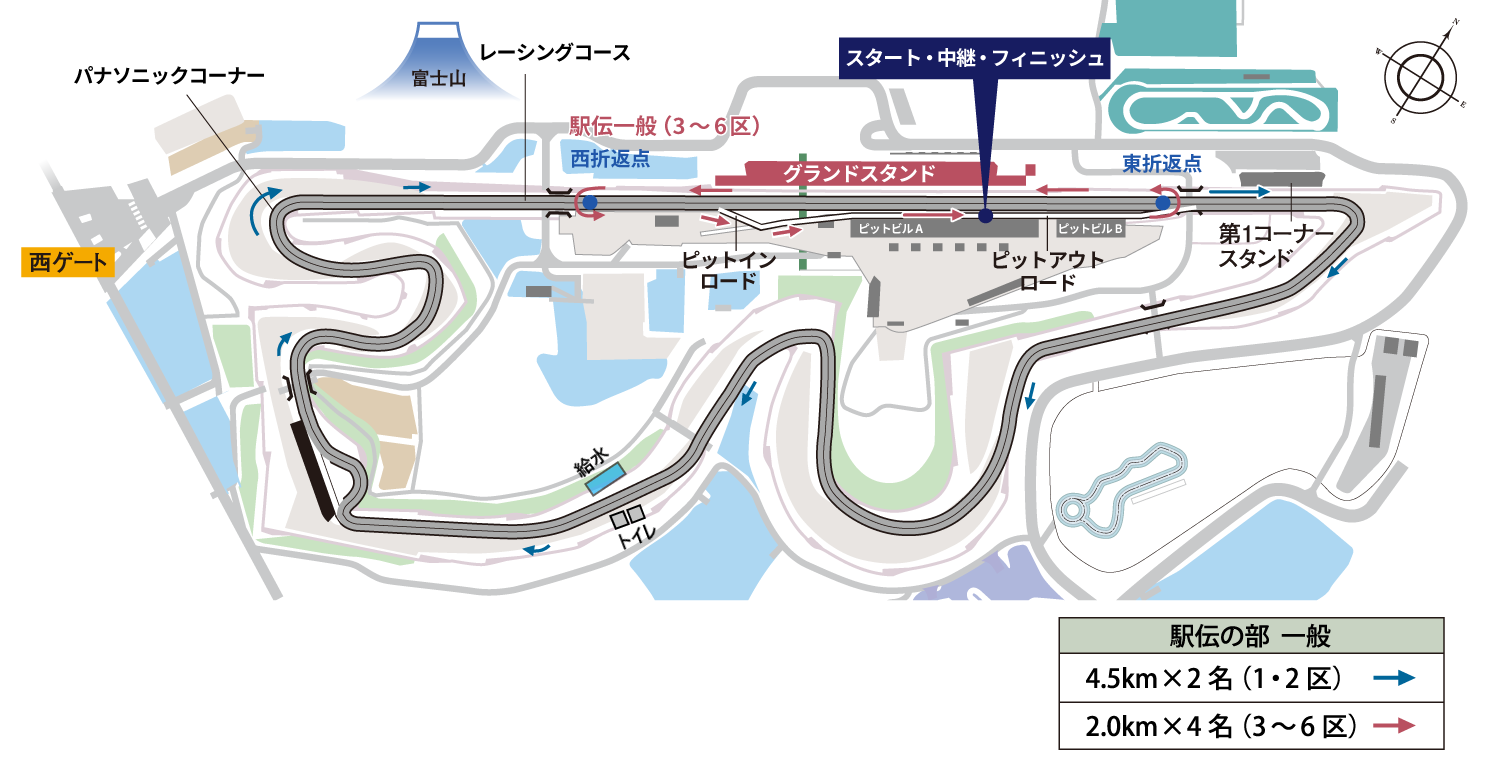 中継点 → ピットアウトロード(東進)→ レーシングコースに合流し、その先で折返 → レーシングコース西進(富士山方向へ約1km)→ 折返点 → ピットインロード → 中継点(フィニッシュ)